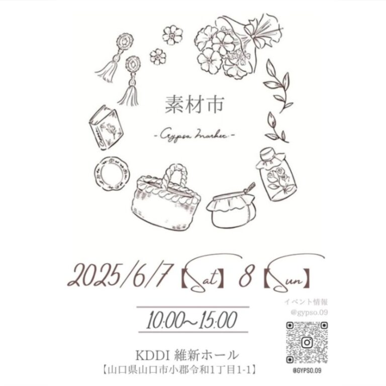 2025年6月7日、8日に山口県山口市の「KDDI維新ホール」で開催予定の「素材市 Gypso Market at KDDI維新ホール」に「あみあみ村」とともに出店します。